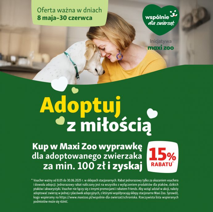 Do końca czerwca każda osoba, która zaadoptuje zwierzę z jednego z partnerskich schronisk lub fundacji współpracujących z Maxi Zoo, może otrzymać voucher rabatowy na wyprawkę dla swojego nowego pupila i skorzystać z 15% zniżki przy zakupach powyżej 100 zł. Voucher przekazywany jest przez schronisko lub fundację przy adopcji i można go zrealizować w sklepach stacjonarnych sieci. To praktyczne wsparcie, ale również symboliczny sygnał, że osoby decydujące się na adopcję nie są pozostawione same sobie.