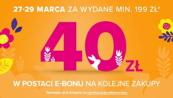 W dniach 27-29 marca zrób zakupy w Carrefour na min. 199 zł i odbierz e-bon o wartości 40 zł na kolejne zakupy.