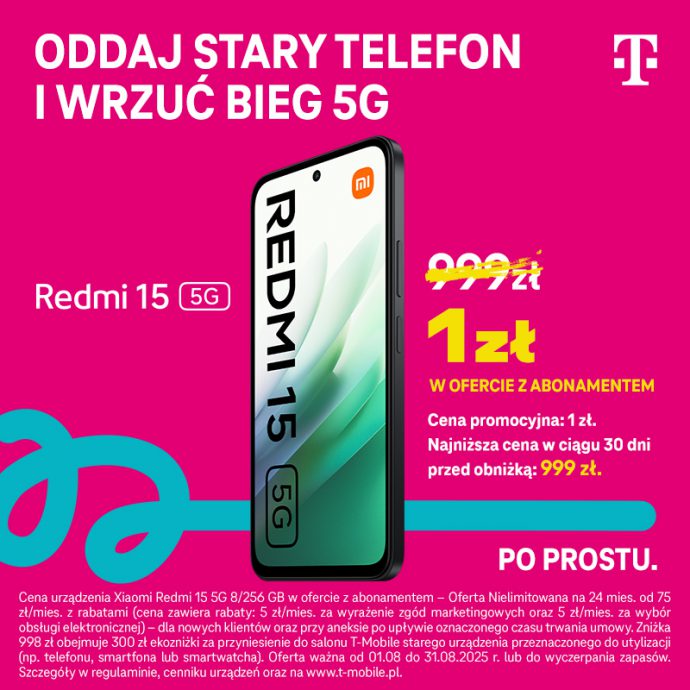 Xiaomi Redmi 15 5G 8/256 GB za 1 zł w ofercie z abonamentem – Oferta Nielimitowana na 24 mies. Zniżka 998 zł obejmuje 300 zł ekozniżki za przyniesienie do salonu T-Mobile starego urządzenia przeznaczonego do utylizacji (np. telefonu, smartfona lub smartwatcha). Oferta obowiązuje do 31.08.2025r. lub do wyczerpania zapasów. Zapraszamy do sklepu T-Mobile