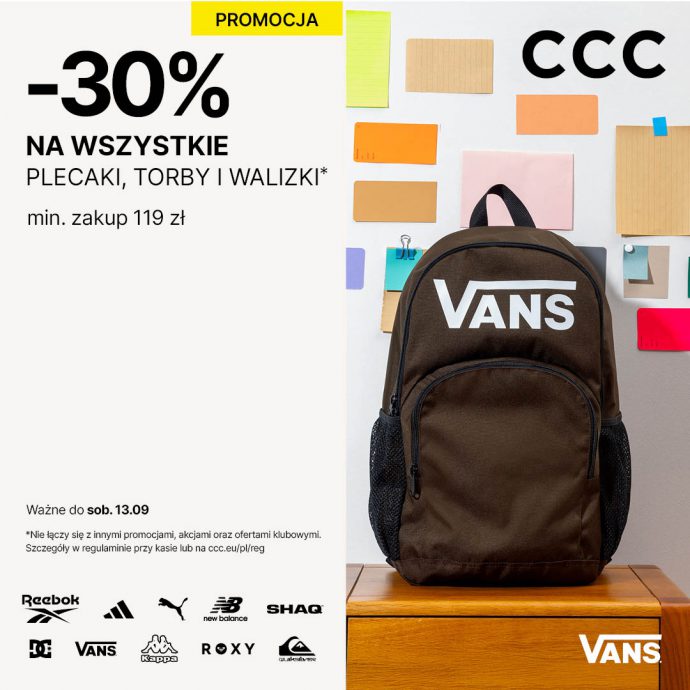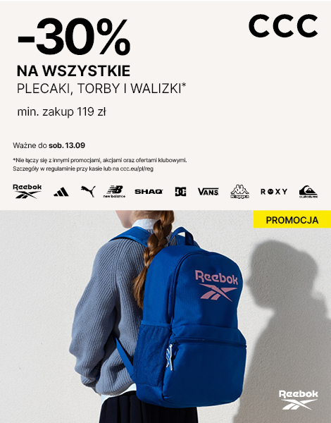 Tam, gdzie jedni ruszają na ostatnie letnie wyjazdy, inni przygotowują się na powrót do szkoły lub biura i… świetnie się składa! Teraz w CCC wszystkie plecaki, torby i walizki 30% taniej! Aby skorzystać z okazji wystarczy zrobić zakupy za min. 119 zł. Reebok, adidas, VANS, Badura, Gino Rossi i inne znane marki w supercenach czekają!