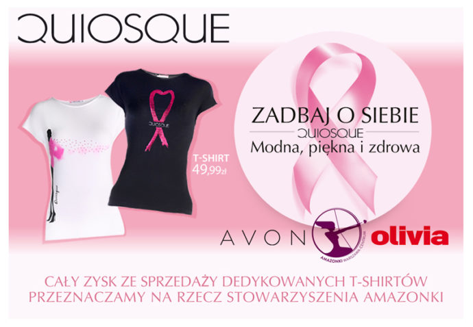 Inspirując się Różową Wstążką – symbolem walki z rakiem piersi – projektantki QUIOSQUE stworzyły wyjątkowe t-shirty. Będą one dostępne w salonach QUIOSQUE w październiku – międzynarodowym miesiącu walki z rakiem piersi. Zysk ze sprzedaży zostanie przekazany na rzecz Stowarzyszenia „Amazonki”, zajmującego się wsparciem kobiet po leczeniu raka piersi i profilaktyką tej choroby. W myśl koncepcji, że dobry wygląd wpływa na pozytywne nastawienie, a tym samym na zdrowie przez pierwsze dwa weekendy października w salonie QUIOSQUE będzie możliwość skorzystania z porad dotyczących stylizacji i wizażu. Konsultantki AVON doradzą klientkom QUIOSQUE jak profesjonalnie wykonać makijaż odpowiedni do ich typu urody.