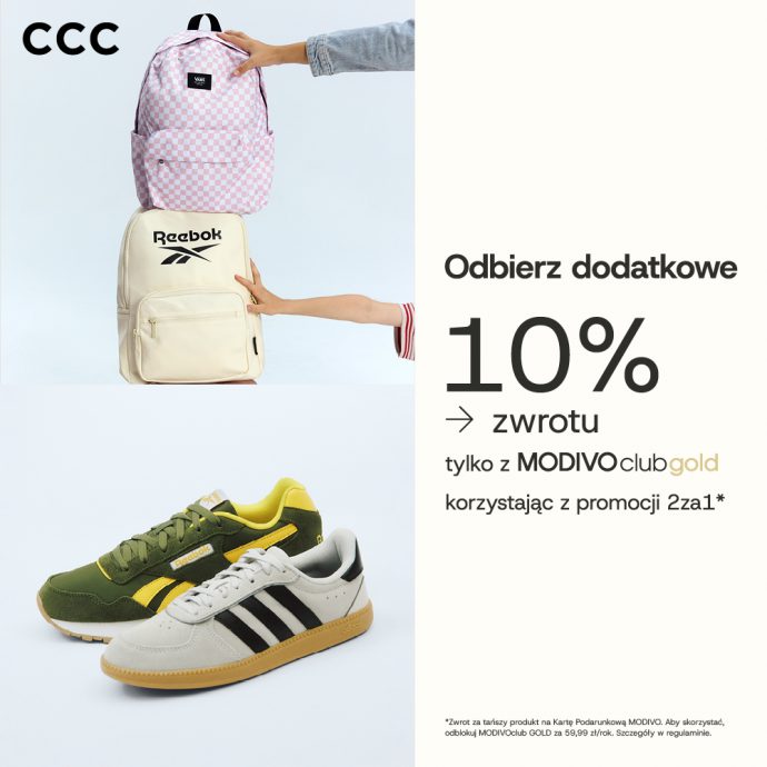 Masz MODIVOclub GOLD? Odbierz 10% zwrotu za swoje zakupy! Dodatkowo, jeśli skorzystasz z promocji 2 za 1, wartość tańszego produktu otrzymasz na Kartę Podarunkową MODIVO. Połącz te dwie promocje i ciesz się jeszcze lepszymi zakupami. Odkryj ulubione marki, wygodne buty i modne dodatki czekające na Ciebie!